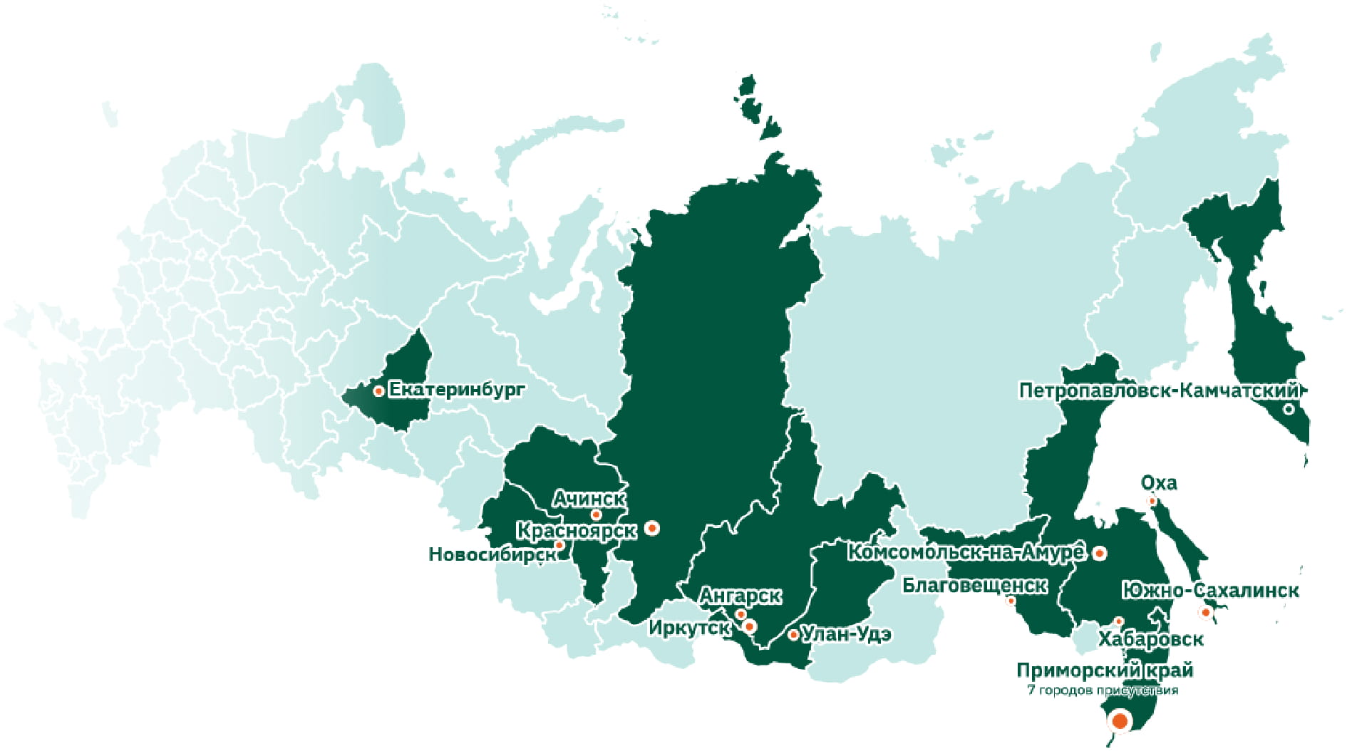 в большинстве экономически значимых городов Приморского, Хабаровского, Камчатского и Красноярского краев, Амурской, Сахалинской, Иркутской, Новосибирской и Свердловской областей, а также Республики Бурятия и обеспечивает территориальную доступность банковских продуктов и услуг.
